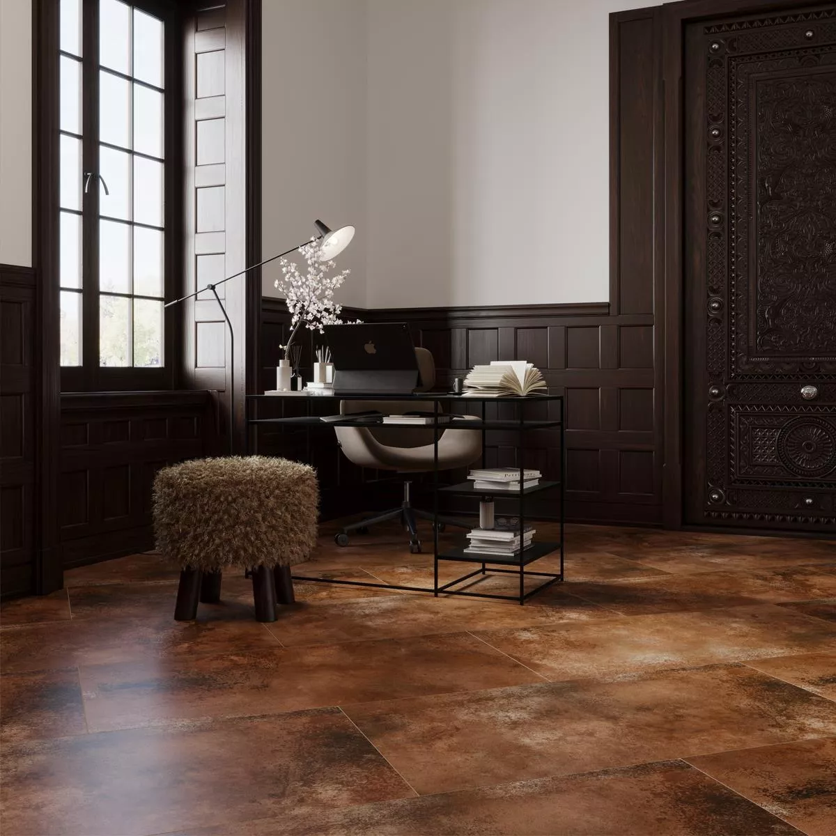 Die Feinsteinzeug Bodenfliese Oregon vereint modernes Design mit hoher Funktionalität. Ihre warme braune Farbgebung in Metalloptik verleiht jedem Raum eine edle und zugleich industrielle Note. Dank der matt glasierten Oberfläche entsteht eine elegante Optik, die sowohl im Wohnbereich als auch in der Küche oder im Badezimmer eine stilvolle Atmosphäre schafft.