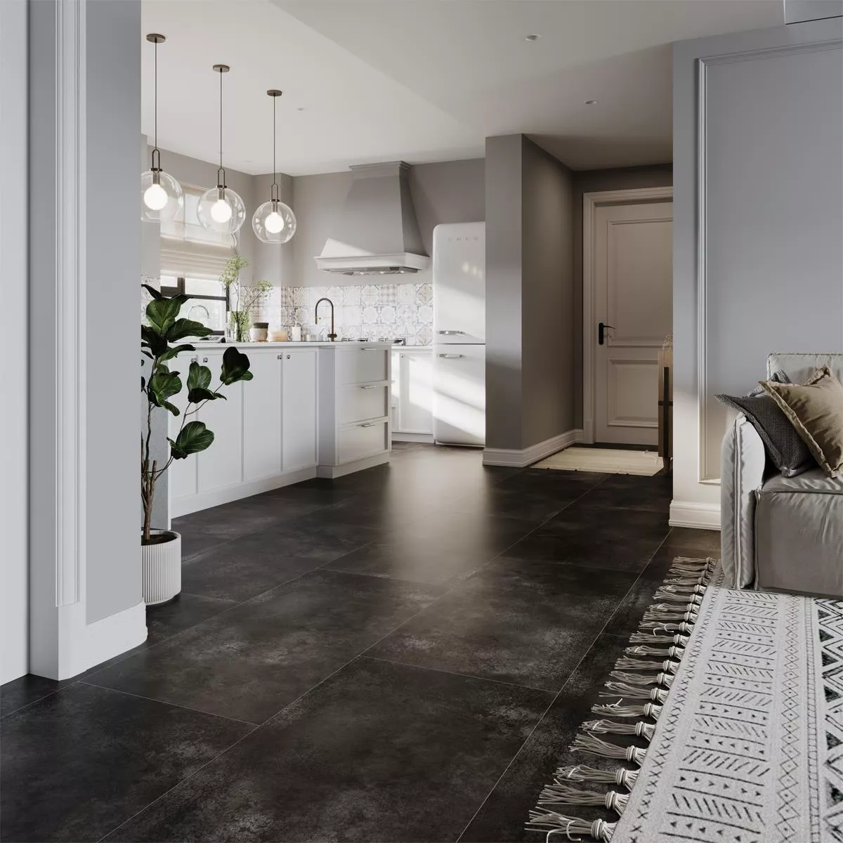 Die Feinsteinzeug Bodenfliese Oregon in Schwarz überzeugt mit ihrer edlen Metalloptik und verleiht jedem Raum eine moderne, stilvolle Atmosphäre. Mit ihrem großzügigen Format von 60 x 120 cm sorgt sie für eine elegante, nahtlose Optik und ist sowohl für den Boden als auch für die Wandverkleidung geeignet. Die matte, glasierte Oberfläche unterstreicht das zeitlose Design und macht die Fliese besonders pflegeleicht.