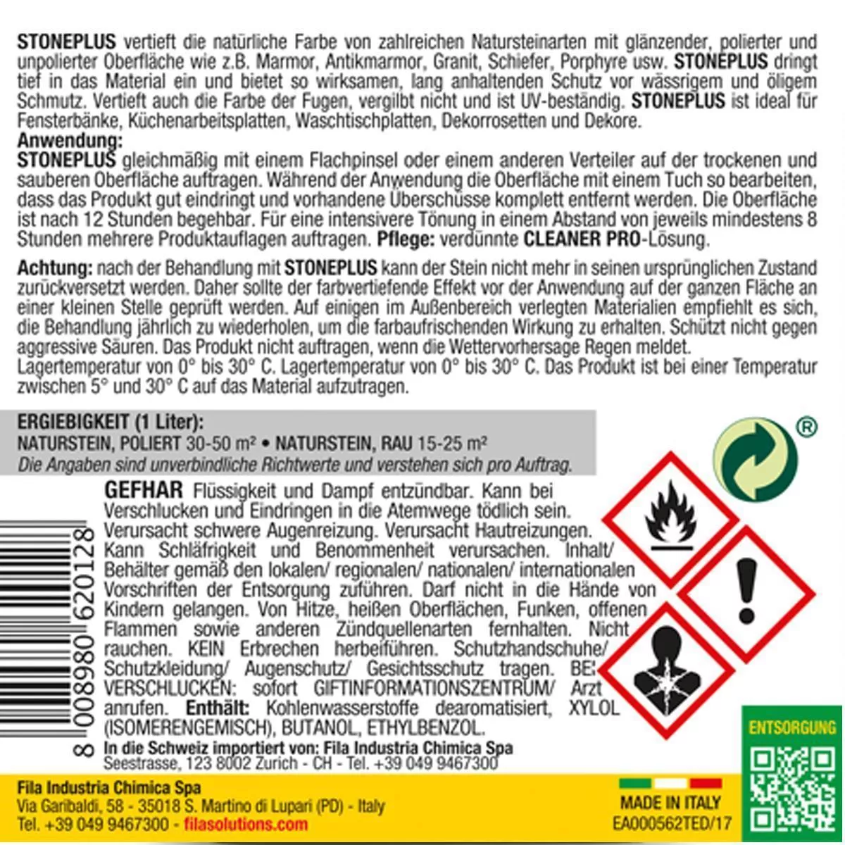 Nach der Behandlung mit STONE PLUS kann der Stein nicht mehr in seinen ursprünglichen Zustand zurückversetzt werden. Daher sollte der farbvertiefende Effekt vor der Anwendung auf der ganzen Fläche an einer kleinen Stelle geprüft werden. Auf einigen im Außenbereich verlegten Materialien empfiehlt es sich, die Behandlung jährlich zu wiederholen, um die farbauffrischende Wirkung zu erhalten. Schützt nicht gegen aggressive Säuren. Das Produkt nicht auftragen, wenn die Wettervorhersage Regen meldet.