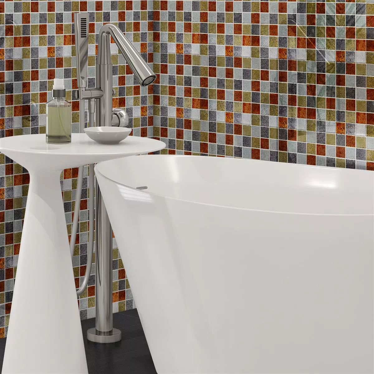 Erleben Sie die kühne Eleganz der Glasmosaik Fliesen Curlew Rot Braun Silber. Diese quadratischen Wandfliesen mit einer Steingröße von 48x48mm verleihen Ihrem Innenbereich eine faszinierende Textiloptik in Rot Braun Silber. Die glänzende Oberfläche und eine Stärke von 4mm bieten eine einzigartige visuelle und taktile Erfahrung.