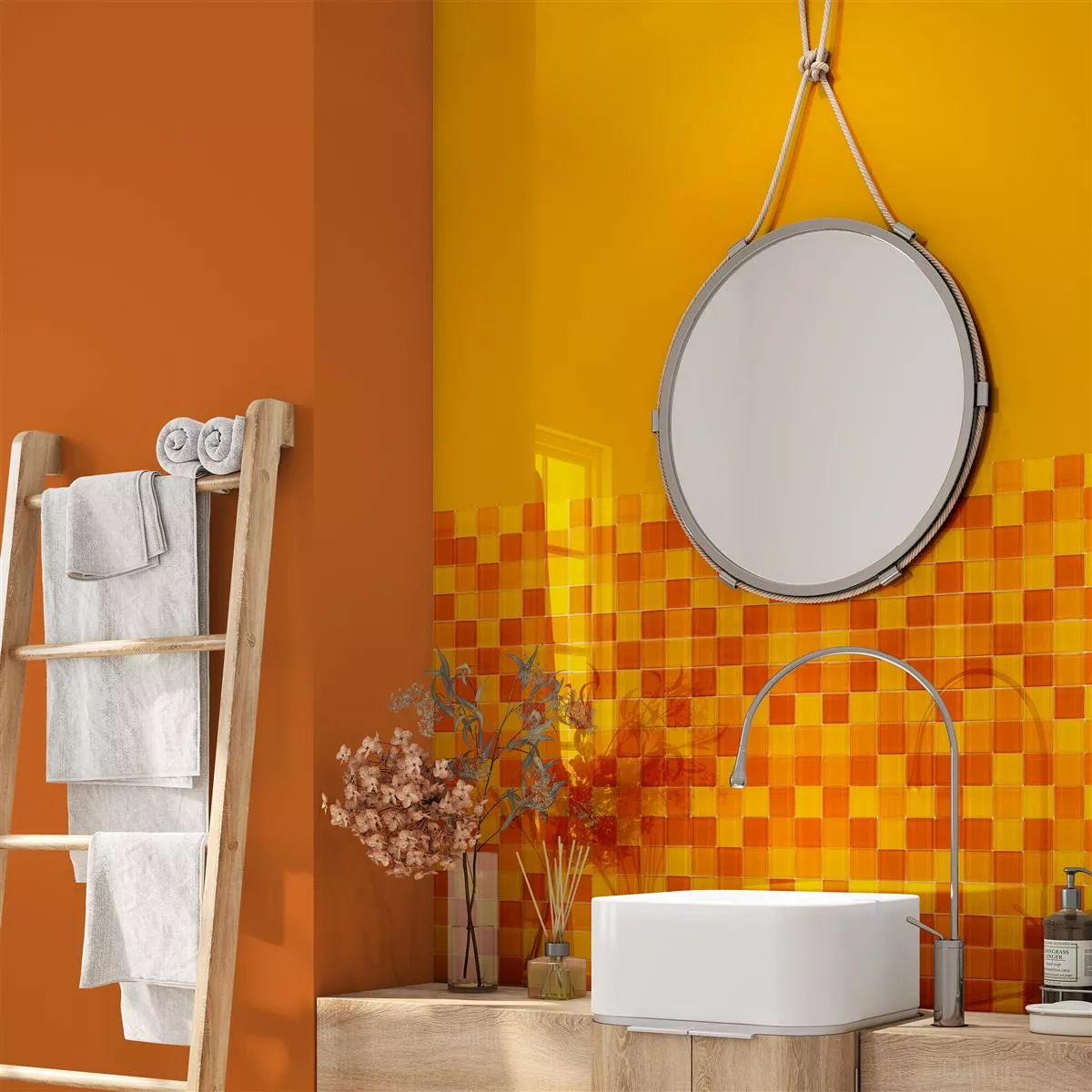 Die Glasgow Mosaikfliese in Orange bringt lebendige Farbe und glänzendes Finish in Ihre Räume und ist ideal für jeden Bereich, der eine auffällige und moderne Note benötigt. Diese Fliese eignet sich hervorragend für Wände und Böden in Bädern, Küchen, Innenräumen und Duschen.