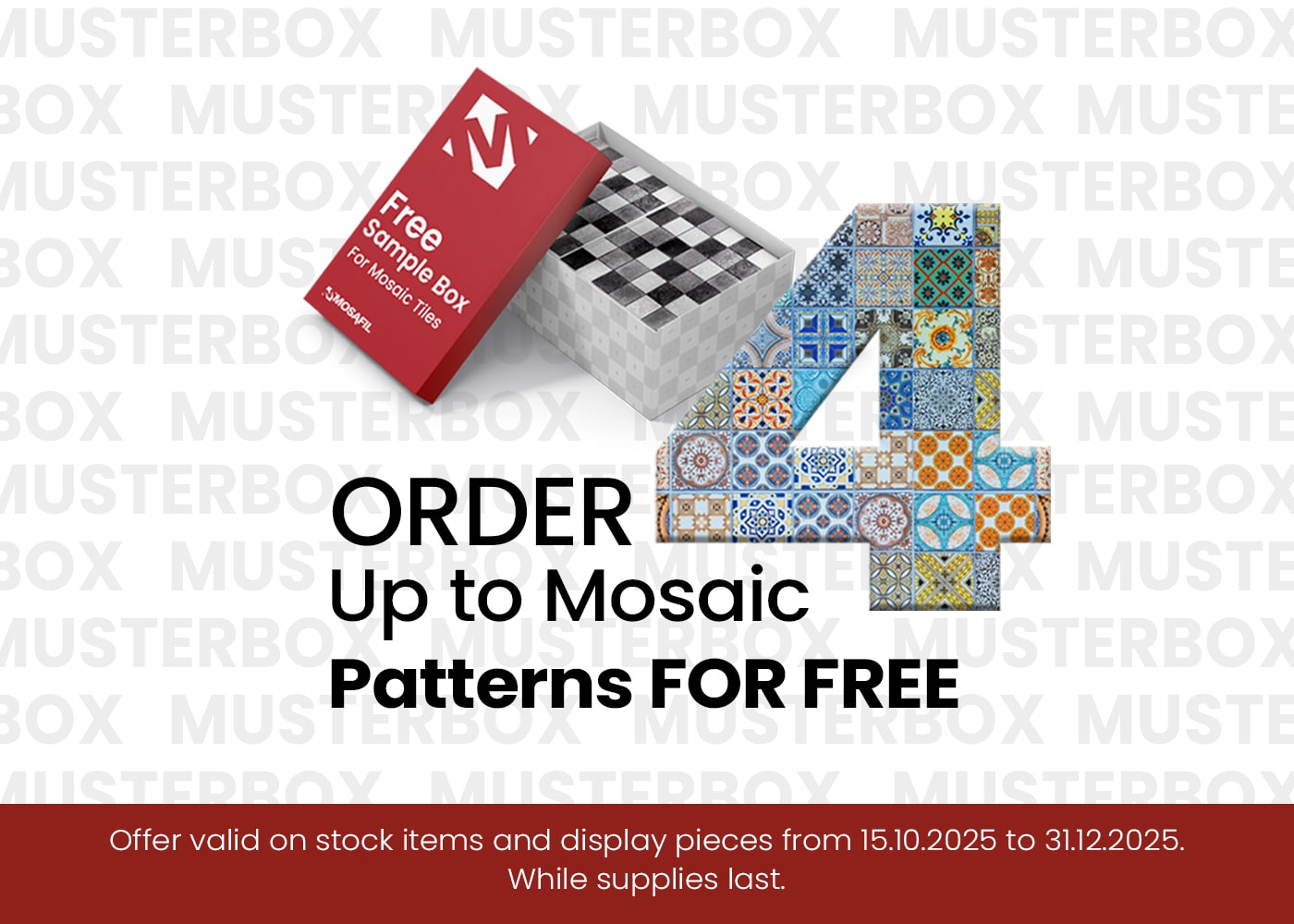 Offriamo costantemente un'ampia selezione di mosaici e piastrelle di alta qualità per bagni e WC, piscine, corridoi, soggiorni, nonché terrazze e vialetti. Da noi troverai varie piastrelle, piastrelle da parete, piastrelle da pavimento, gres porcellanato, bordure e mosaici in vetro, come mosaici in pietra naturale, rivestimenti murali, pannelli, mosaici per piscina, ciottoli di fiume, mosaici effetto legno, mosaici metallici, mosaici in pietra naturale, mosaici in acciaio inox, mosaici in alluminio, frammenti di marmo, mosaici in marmo, mosaici da cucina, piastrelle da cucina, piastrelle in pietra naturale, travertino, ardesia e piastrelle da bagno. Mosaici per bagno con molte possibilità di design. Lasciati ispirare dalle varie forme, materiali e colori! Sfoglia le nostre categorie di prodotti 24 ore su 24, che aggiorniamo continuamente con nuovi articoli. Ordina facilmente da casa le piastrelle o i mosaici desiderati – come campioni o nella quantità necessaria. Consegnamo rapidamente e in sicurezza in tutta Europa. Saremo lieti di consigliarti personalmente e creare con te offerte su misura.