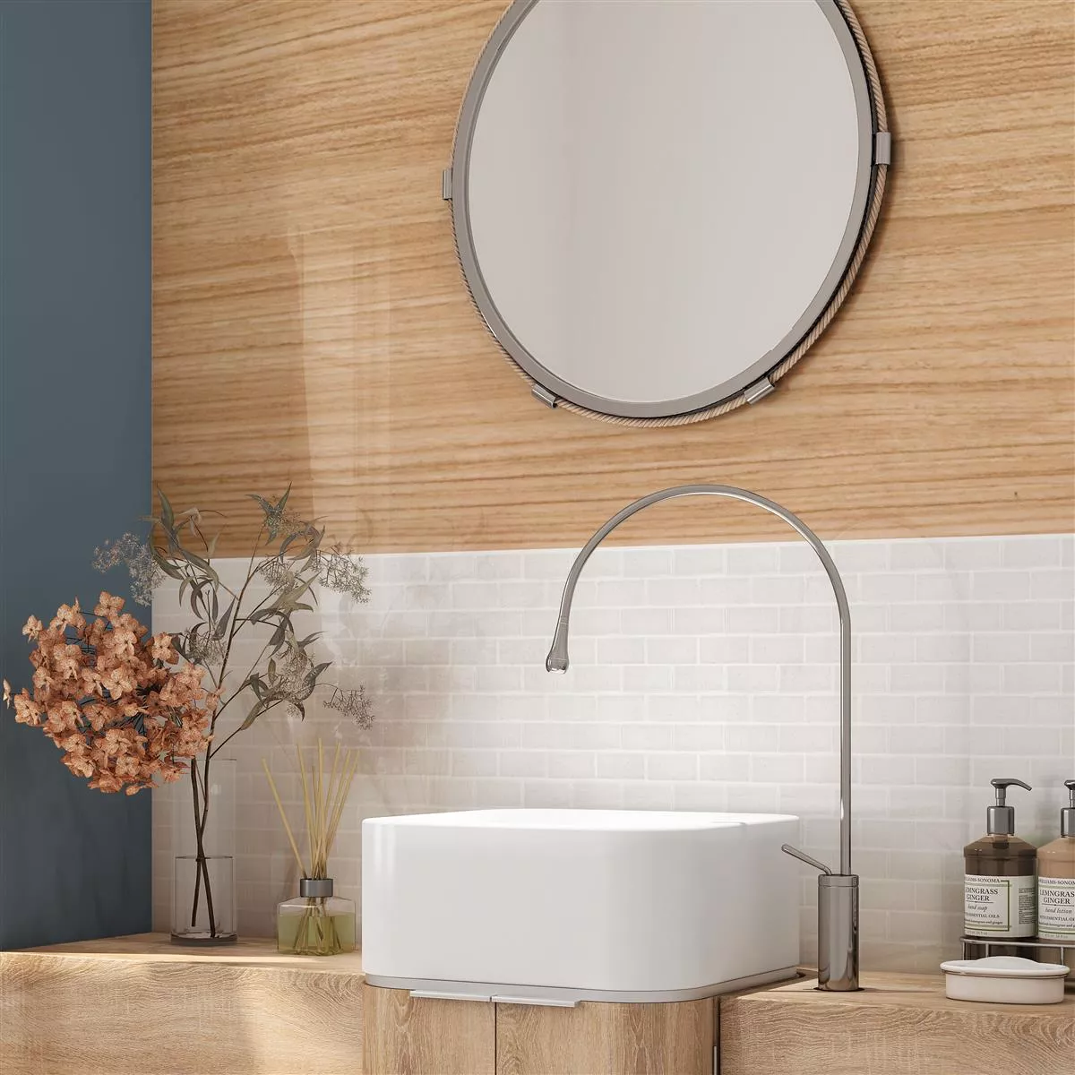 Die Keramik Mosaikfliesen "Eldertown Brick Weiß" verleihen Ihrem Raum eine charmante Eleganz. Mit einer glänzenden Oberfläche, rechteckigem Format (30,3x30,6cm) und einer Steingröße von 48x98mm präsentieren sich diese Mosaik- und Wandfliesen als stilvolle Ergänzung für Wohnräume, Küchen und Duschen. Eine Matte (0,092m²) wiegt nur 1,5 kg und ist dank einer Stärke von 7mm leicht zu handhaben. Die Fugenbreite von 3mm schafft ein harmonisches Erscheinungsbild. Die Nassbereichseignung macht sie vielseitig einsetzbar.