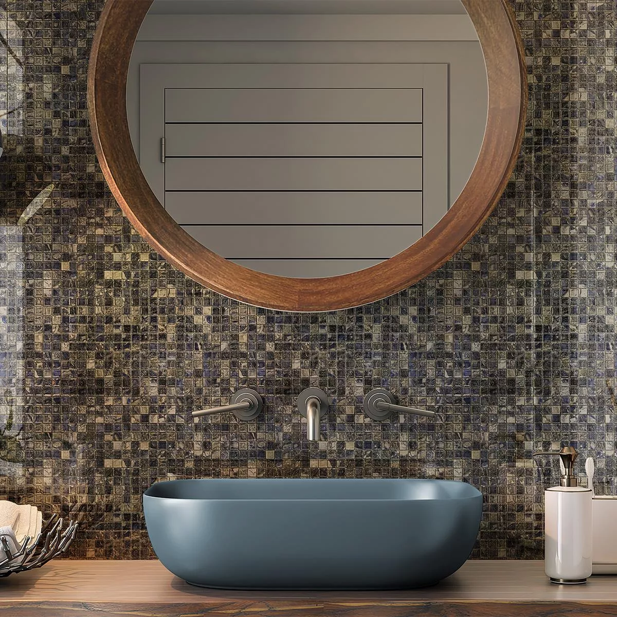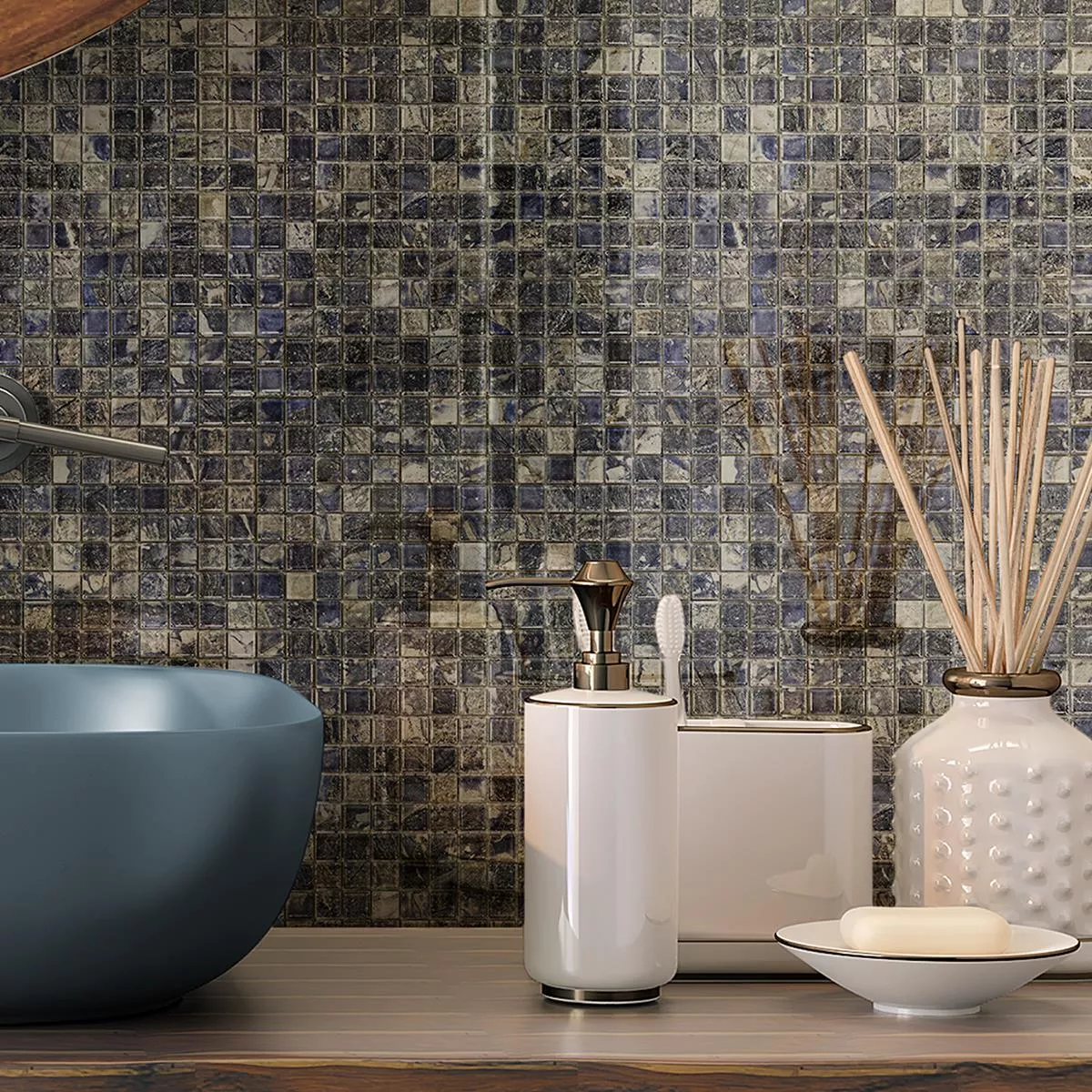 Die Keramik Mosaikfliese Elysium in Dunkelblau verleiht Ihren Räumen eine edle und tiefgründige Ausstrahlung. Ihre glänzende Oberfläche in Marmoroptik sorgt für eine luxuriöse und moderne Atmosphäre, die sowohl Wänden als auch Böden eine besondere Note verleiht.