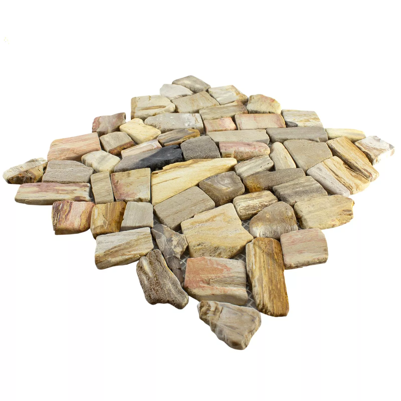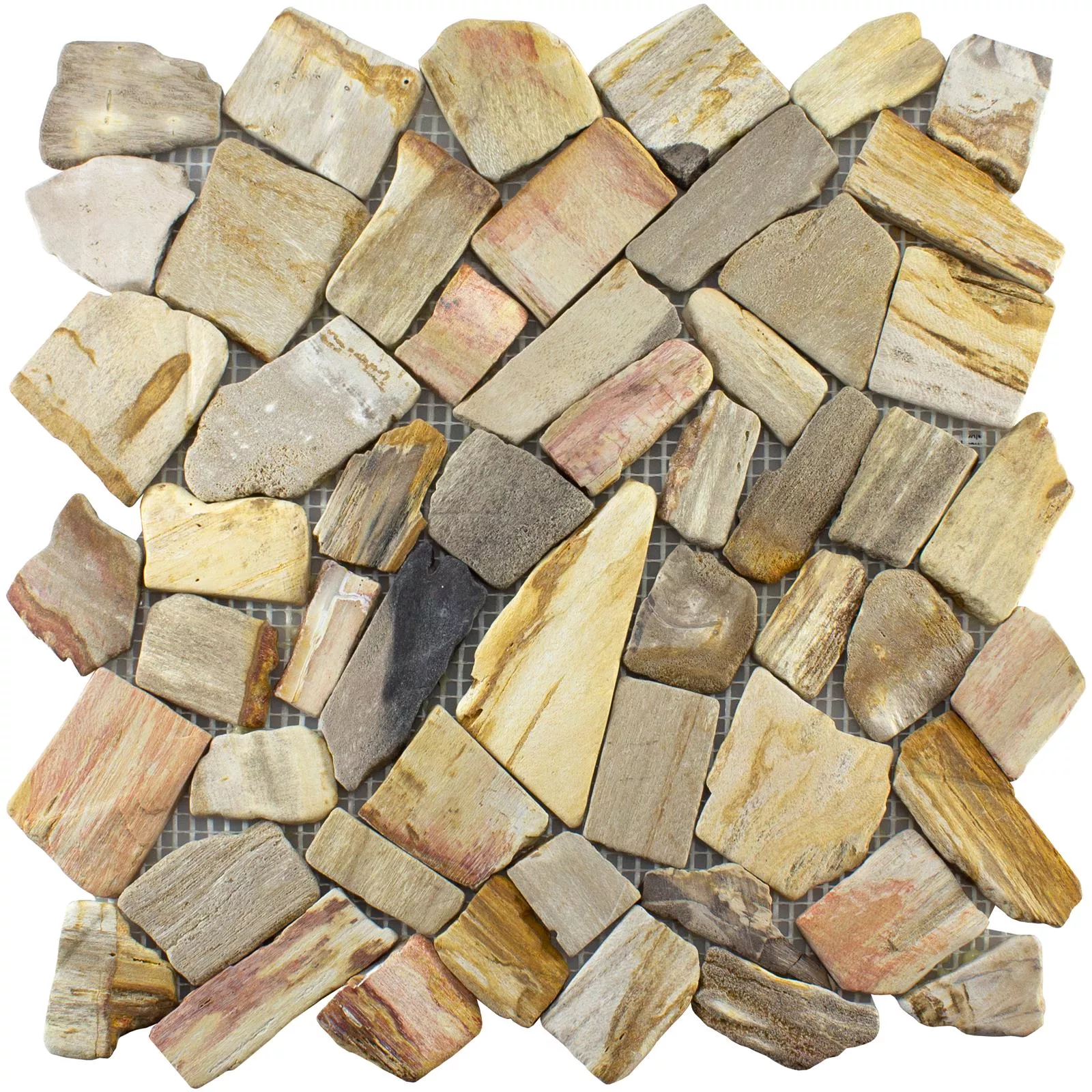 Die Fliesen sind in einem Bruchstein-Format angeordnet und haben eine Holzoptik, die eine warme und natürliche Atmosphäre schafft. Eine Matte hat eine Größe von 30,5x30,5cm und eine Fläche von 0,093m². Diese Mosaikfliesen eignen sich für den Innen- und Außenbereich sowie für Nassbereiche wie Küchen und Bäder.