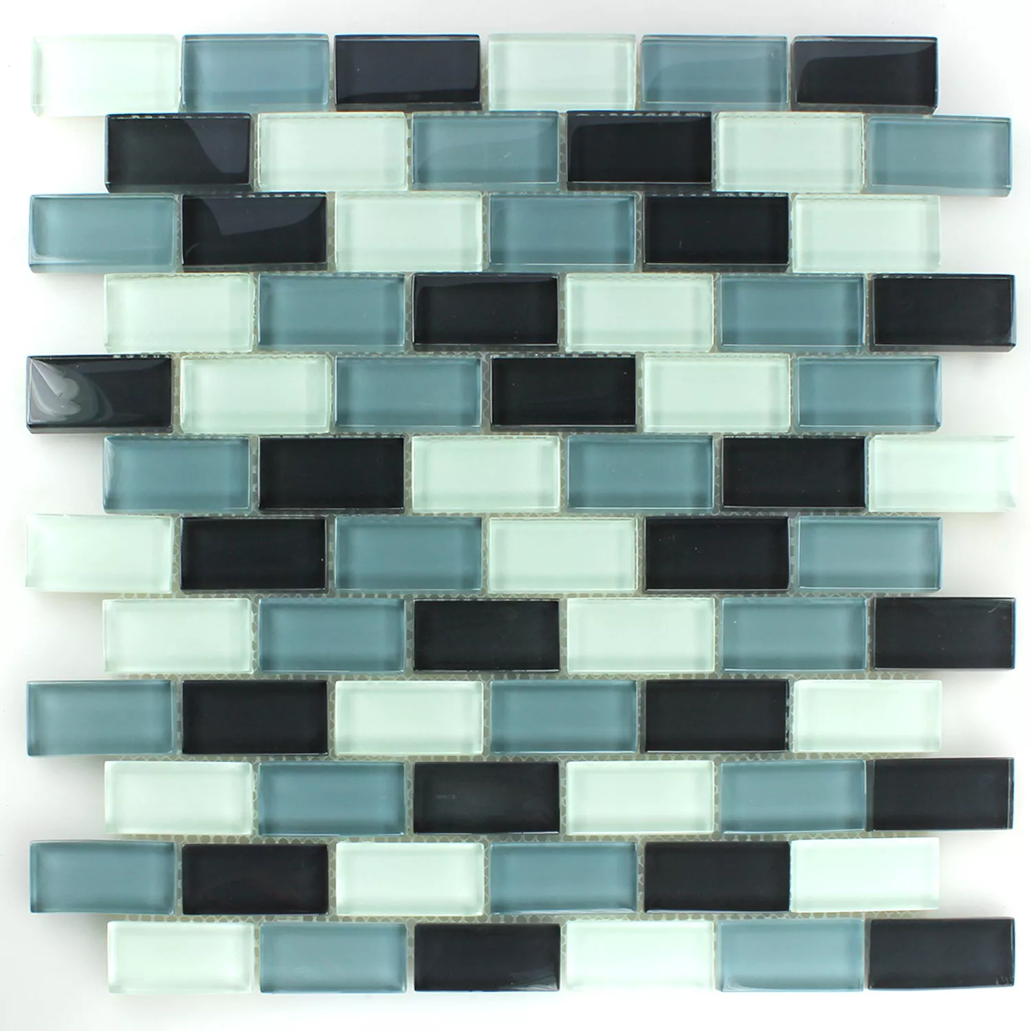 Dieses Crystal Glasmosaik in verschiedenen Farben im Wechsel dient hervorrangend zur kreativen Gestalten und zur dekorativen Wandverkleidung, somit sind individuelle Gestaltungsmöglichkeiten in Bäder, Küchen, Schwimmbäder, an Säulen und im Wellness-Bereich möglich. Es ist auf ein Netz geklebt, somit lässt es sich gut verarbeiten und individuell zuschneiden. Das Crystal Mosaik in rechteckiger Form, in der Farbe Schwarz - Grau und einer glänzenden Oberflächenbeschaffenheit, hat ein Mattenmaß von 31,5x30,5cm und eine Steingröße von 2,5x5cm. Die Stärke der einzelnen Steine beträgt 0,8cm.
