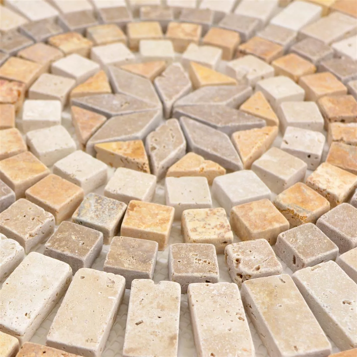 Fliesen aus Naturstein sind sehr begehrt, gerade wenn sie ein schönes Mosaikmuster aufweisen. Die Naturstein Rosone Alligator Fliesen weisen eben genau so etwas auf. Sie sind in Beige Braun Gold gehalten und erinnern an die Rückenschuppung eines Alligators. Das Muster weist aber noch weitere zahlreiche Feinheiten auf. Der Mittelpunkt der Fliesenmatte ist eine Blume. Die Fliesensteine weisen verschiedene Größen und Formen auf, damit ein schönes Muster auf der Fliesenmatte entsteht.