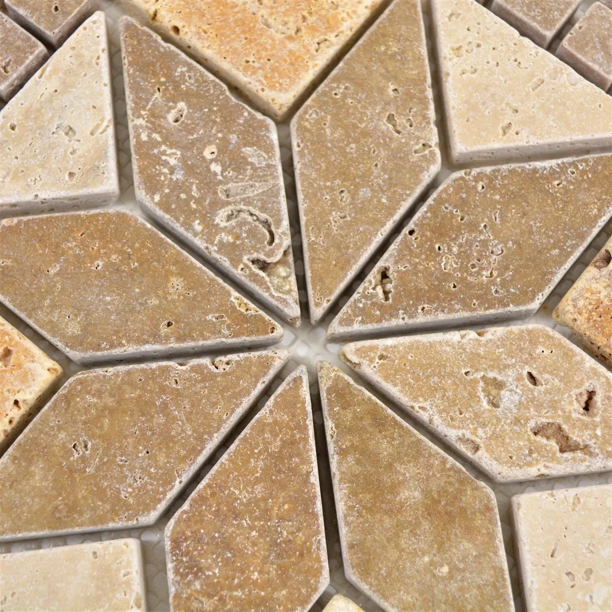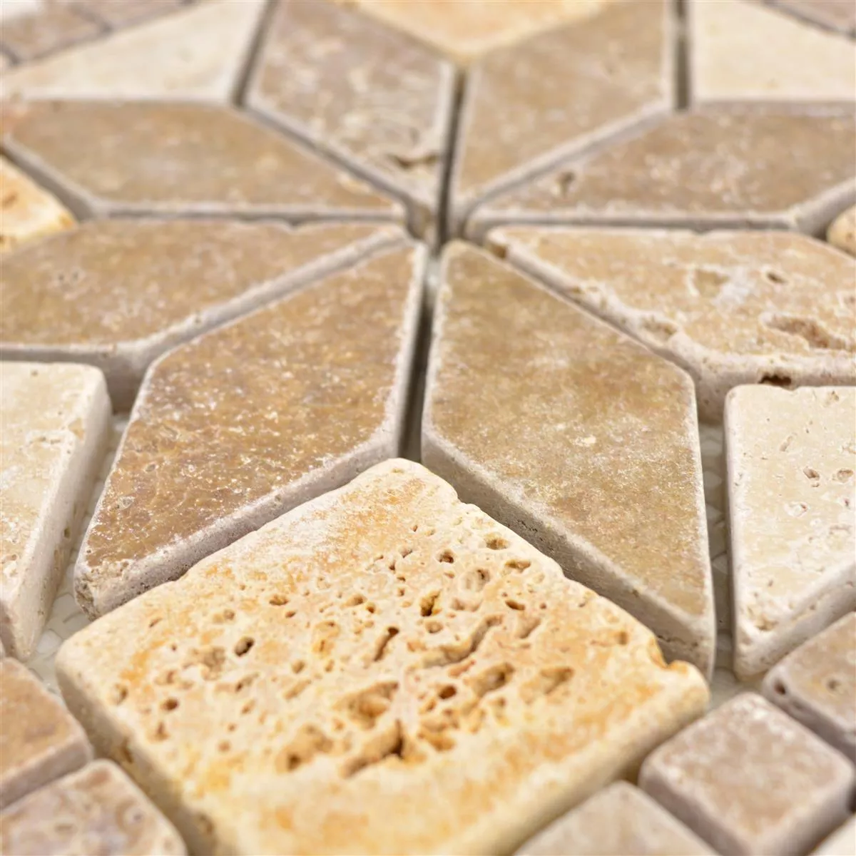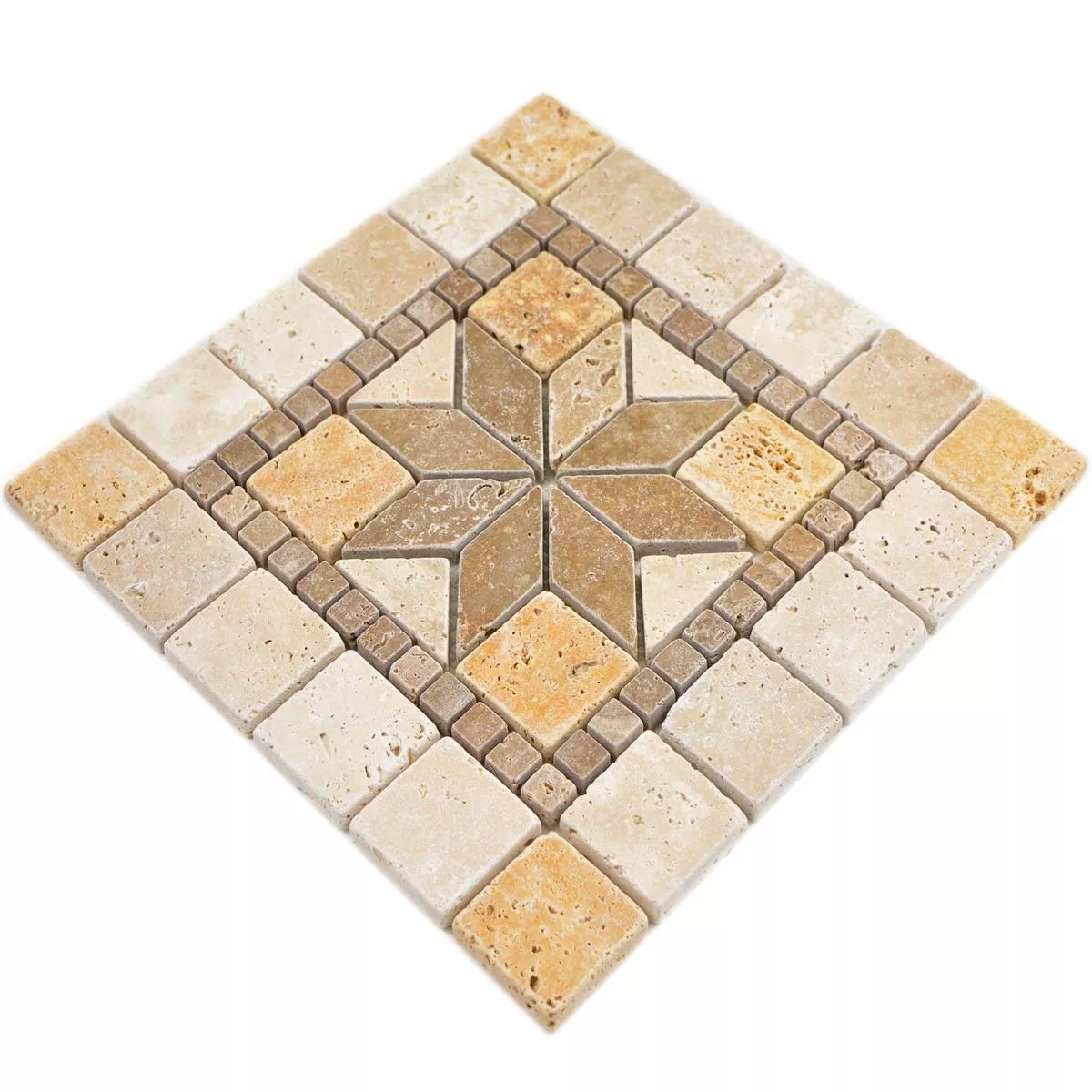 Ein Naturstein Mosaik ist ein Blickfang. Bereits lange vor unserer Zeitrechnung wurden mit religiösen und alltäglichen Motiven Mosaike gestaltet. Heute profitieren Wohnräume von Mosaiken. Naturstein Rosone Volney Beige Braun Gold 30x30cm bieten eine Fülle Gestaltungsmöglichkeiten.