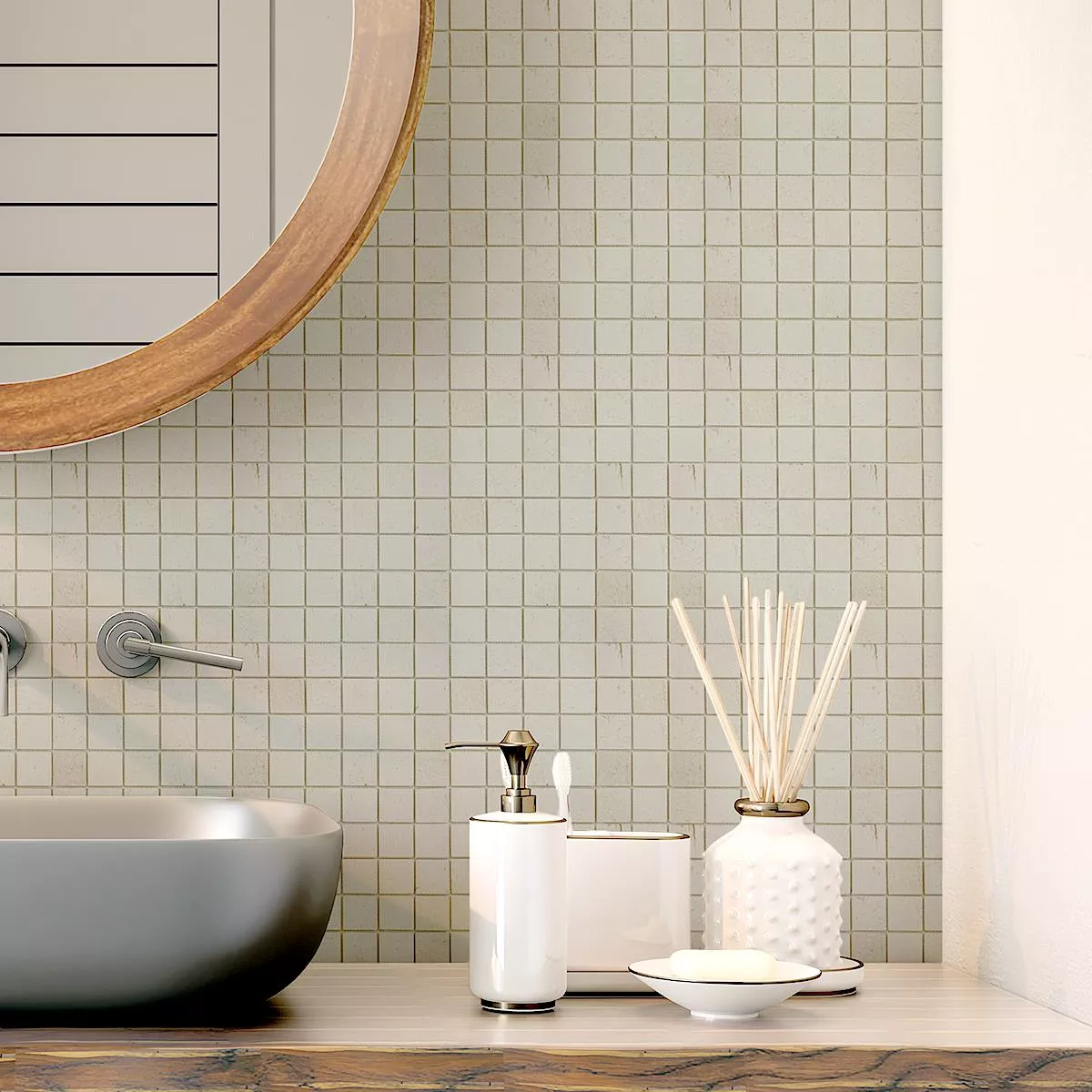 Jede Fliese und jedes Mosaik haben aufgrund individueller Materialeigenschaften und Anwendungsbedingungen unterschiedliche Anforderungen an das Zuschneiden, Verlegen und Verarbeiten. Fragen Sie einen örtlichen Experten für das korrekte und sichere Verlegen Ihrer Mosaike oder Fliesen. Wir haften nicht für unsachgemäßen Gebrauch und fehlerhafte Verarbeitung von Baumaterialien.
